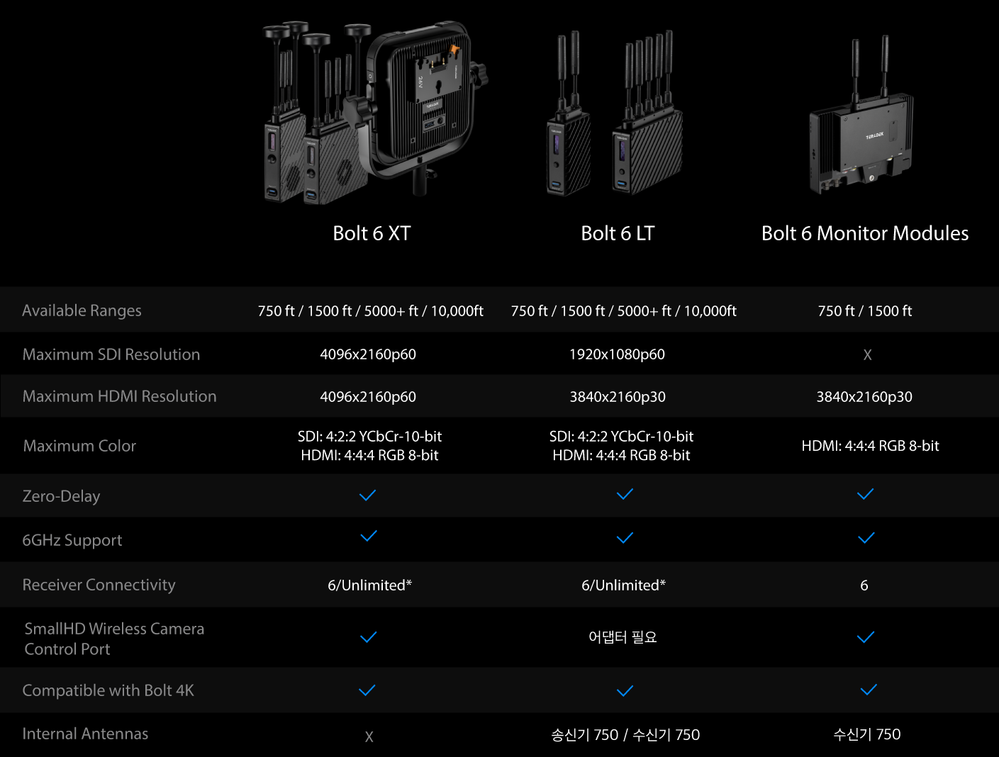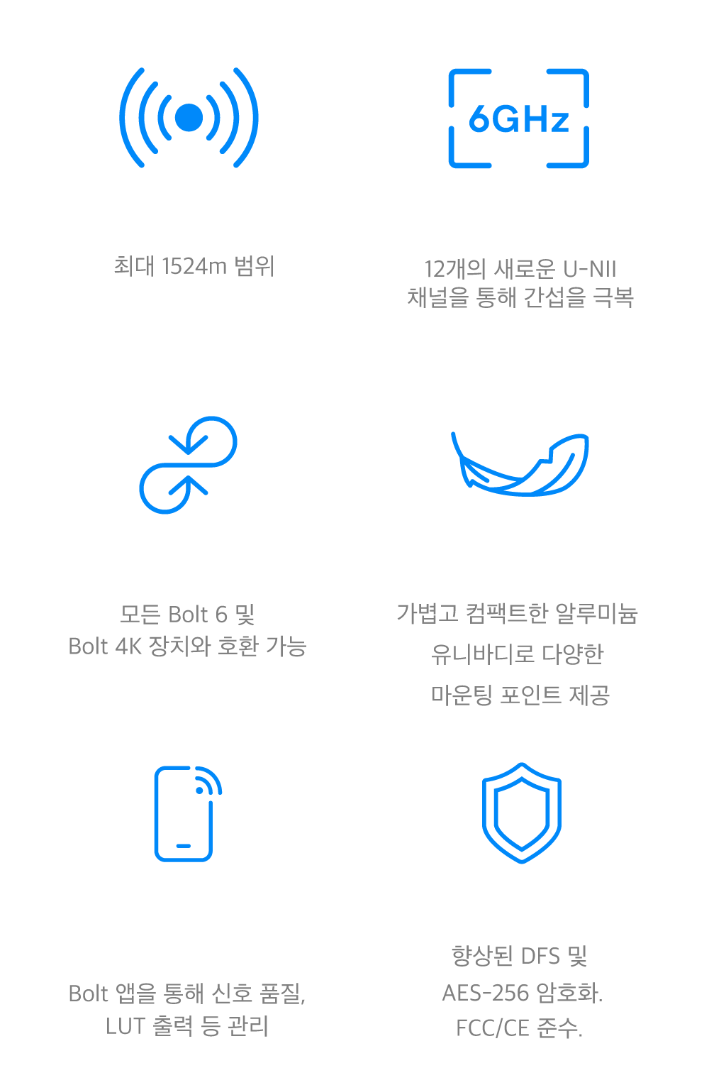 - Bolt 6 및 Bolt 4K 모든 장비(내부 또는 외부 안테나)와 호환