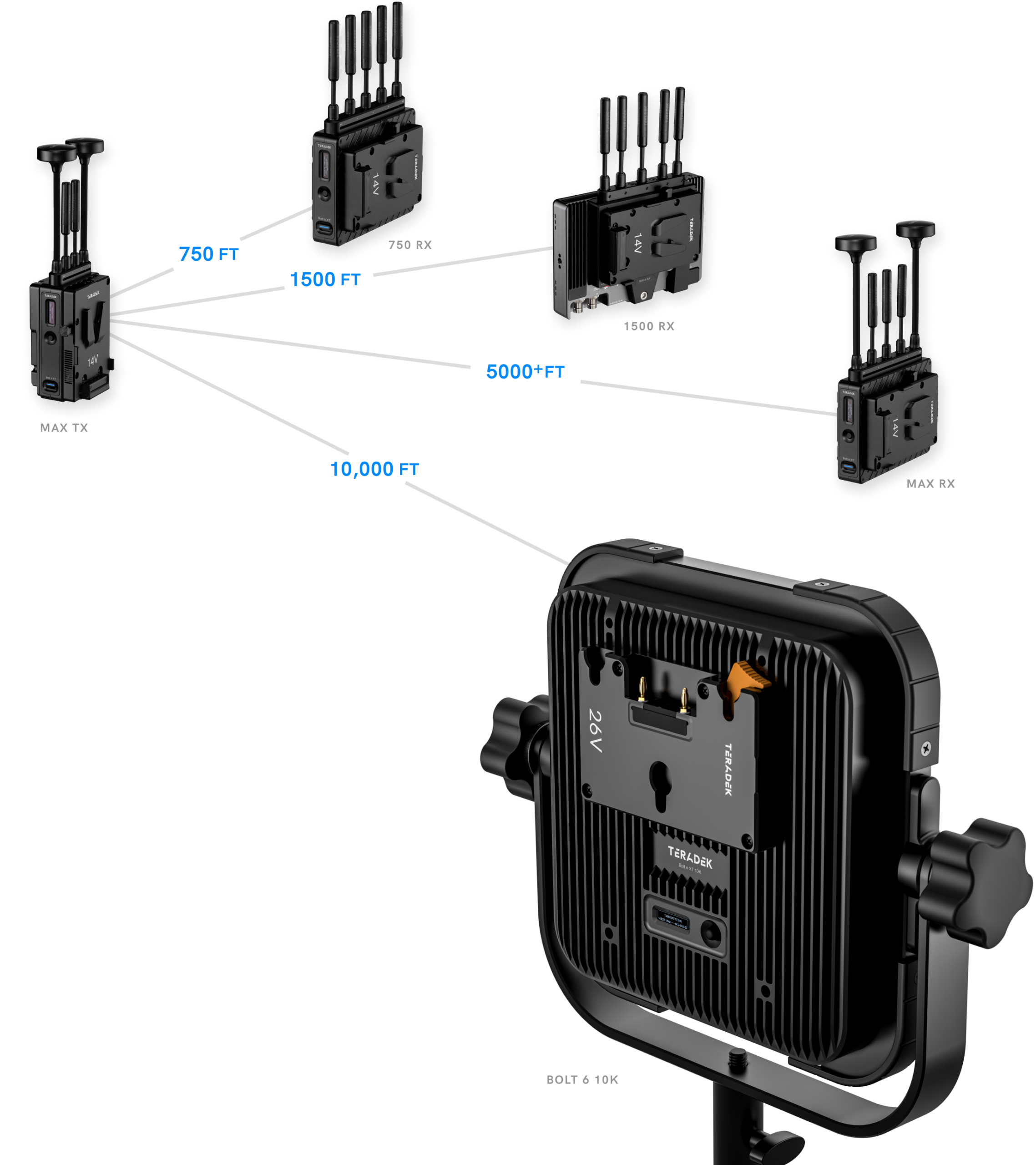 Bolt 6는 6GHz 기반의 Zero-delay 무선 영상 신호를 기존보다 훨씬 더 멀리 전송할 수 있습니다. 750ft, 1500ft, 5000ft, 그리고 최대 10,000ft까지 지원하여 다양한 촬영 환경에 맞는 선택이 가능합니다.