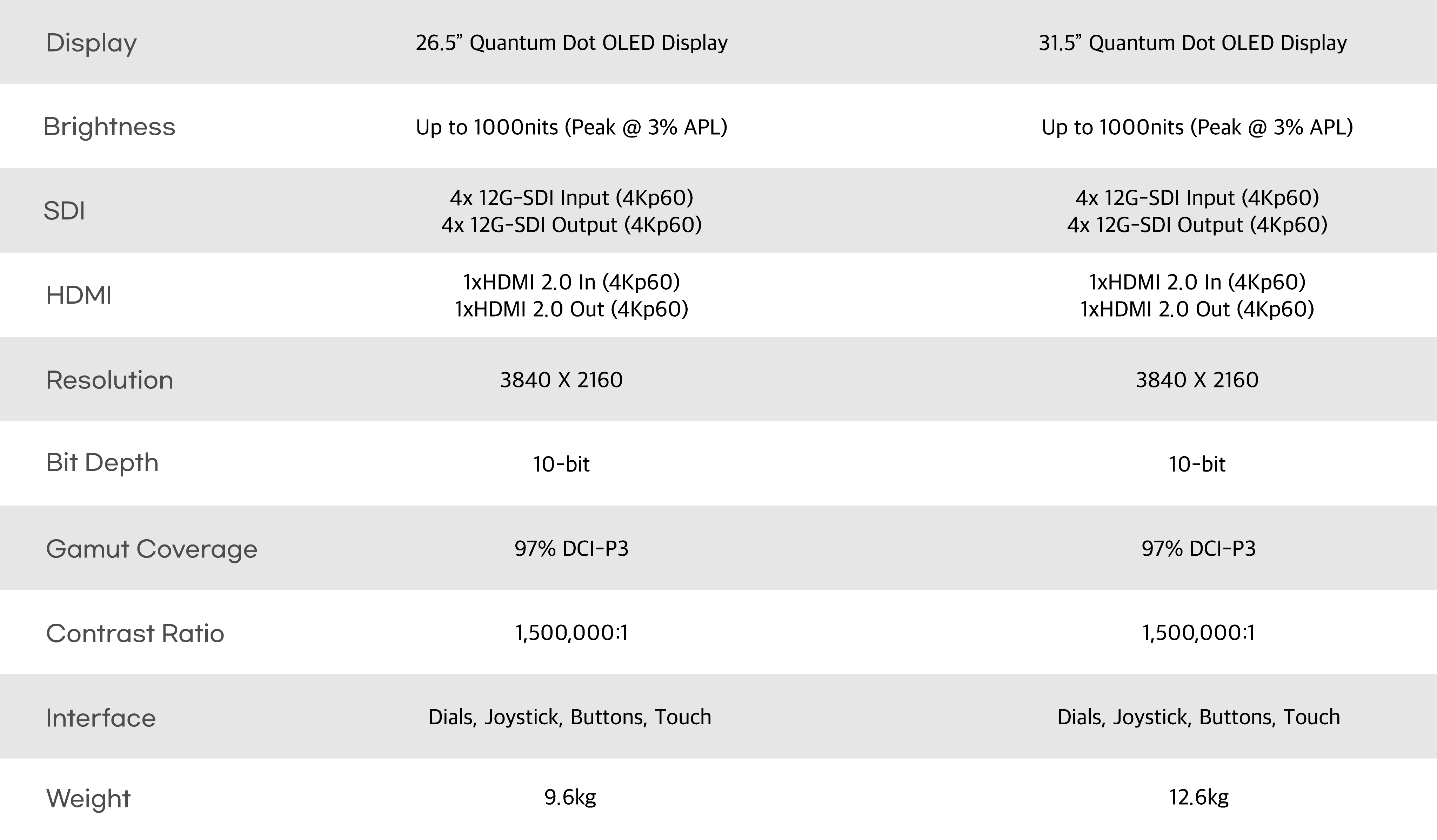 OLED 특유의 깊은 블랙과 픽셀 단위의 정밀함에 퀀텀닷의 고휘도와 넓은 색 영역을 결합하여, 4K HDR 환경에서 탁월한 명암비와 정확한 색 재현을 제공합니다. 세트 현장은 물론 전문적인 모니터링 환경에서도 일관된 결과를 보장합니다.